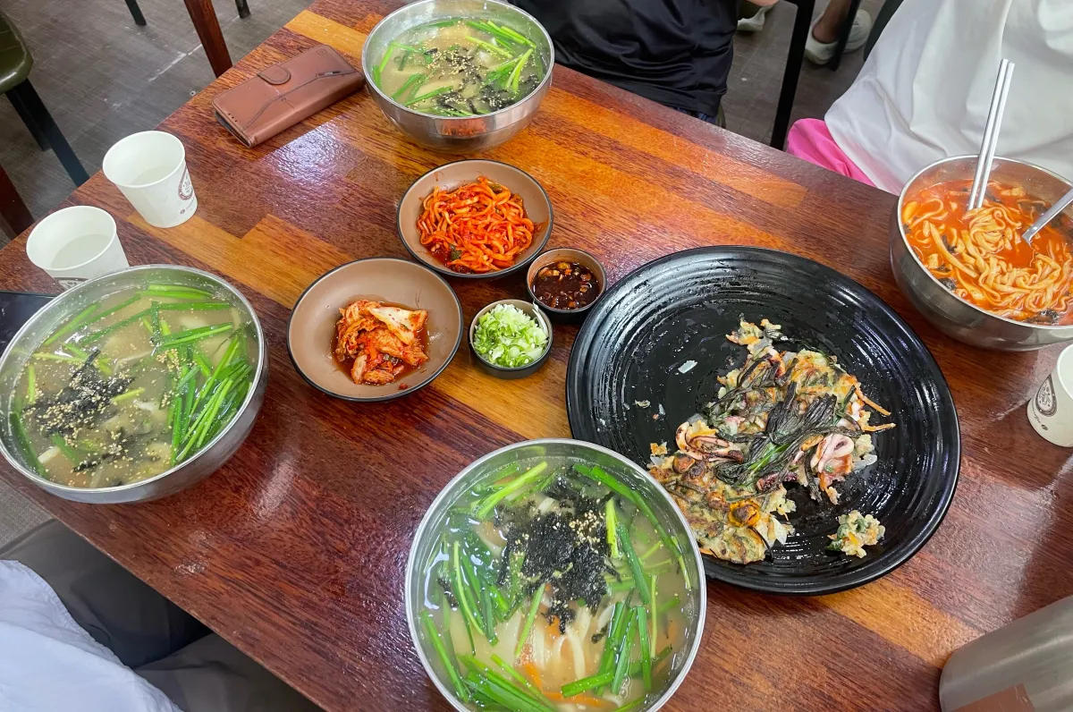 김치와 무생채 반찬은 셀프코너에서 추가로 이용할 수 있어요. 저는 칼국수를 주문했는데 너무 뜨거워서 빠르게 먹을 순 없었지만, 양이 많아서 푸짐하니 좋더라구요. 파전을 주문하지 않았더라면 다 먹었을 것 같습니다.