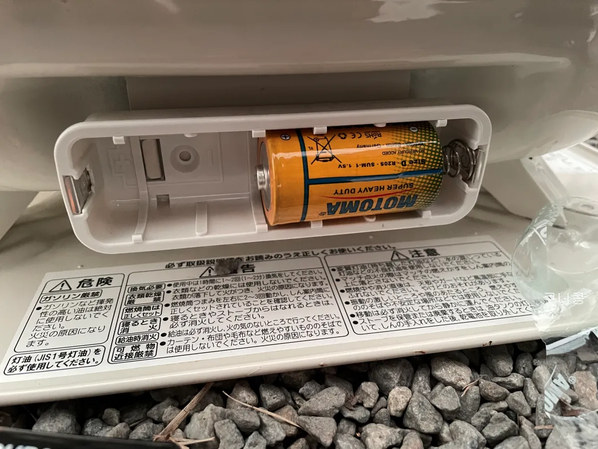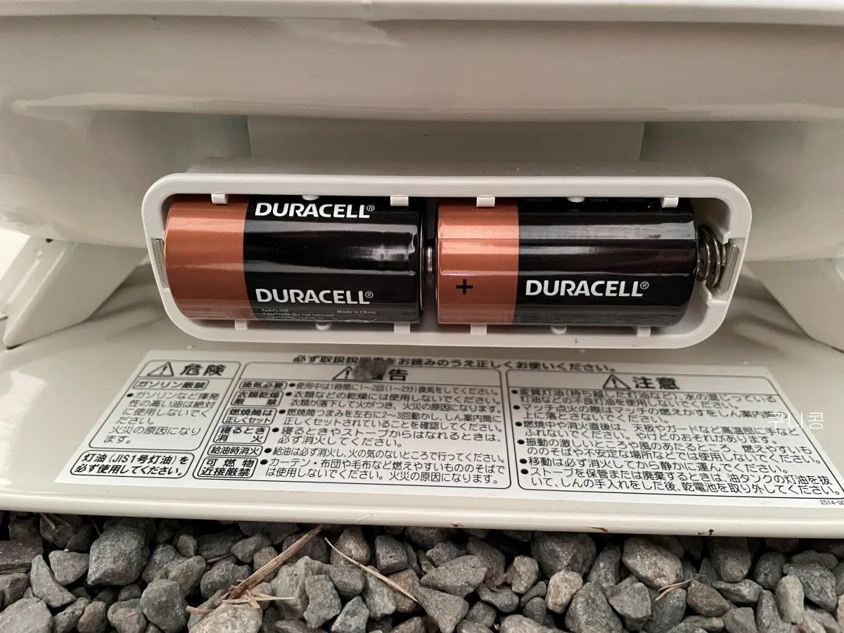 등유난로 배터리 넣는 곳을 열어보면 큰 건전지 2개가 들어있어요. 보통 AAA 또는 AA를 자주 사용하는데 이렇게 큰 사이즈는 처음봤네요.