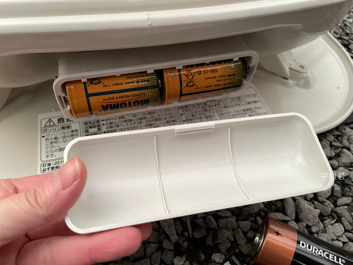 등유난로 배터리 넣는 곳을 열어보면 큰 건전지 2개가 들어있어요. 보통 AAA 또는 AA를 자주 사용하는데 이렇게 큰 사이즈는 처음봤네요.