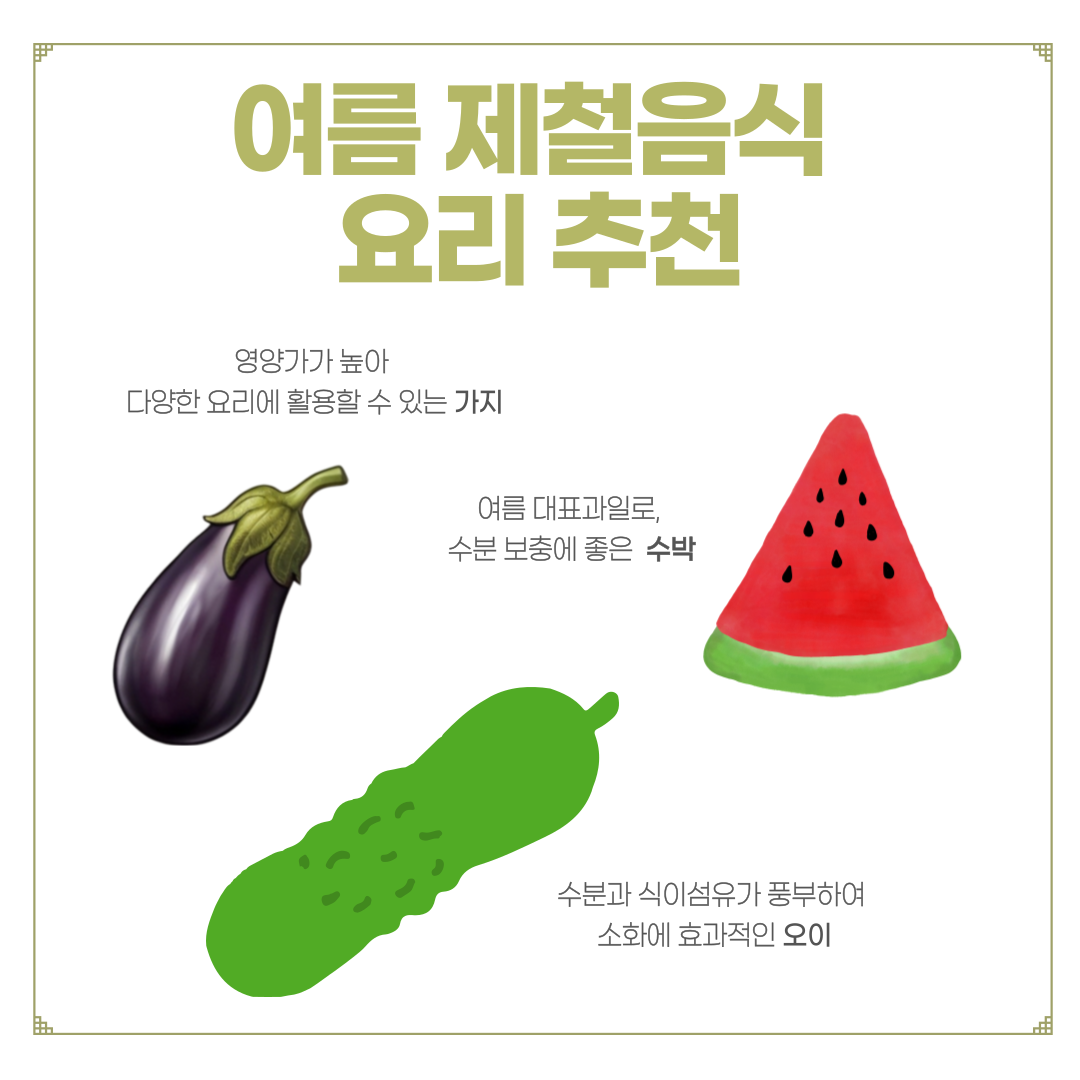 여름철에는 신선한 제철음식을 활용한 요리로 건강한 식단을 구성하는 것이 중요합니다. 수박 샐러드, 가지 구이, 오이냉국 등 다양한 요리를 통해 맛있고 영양가 높은 여름 식단을 즐겨보세요. 신선한 재료와 간단한 조리법으로 건강한 여름을 보내시길 바랍니다. 여름 제철음식을 활용한 요리법으로 더위도 이겨내고, 영양도 채우며 건강한 식사를 즐겨보세요.