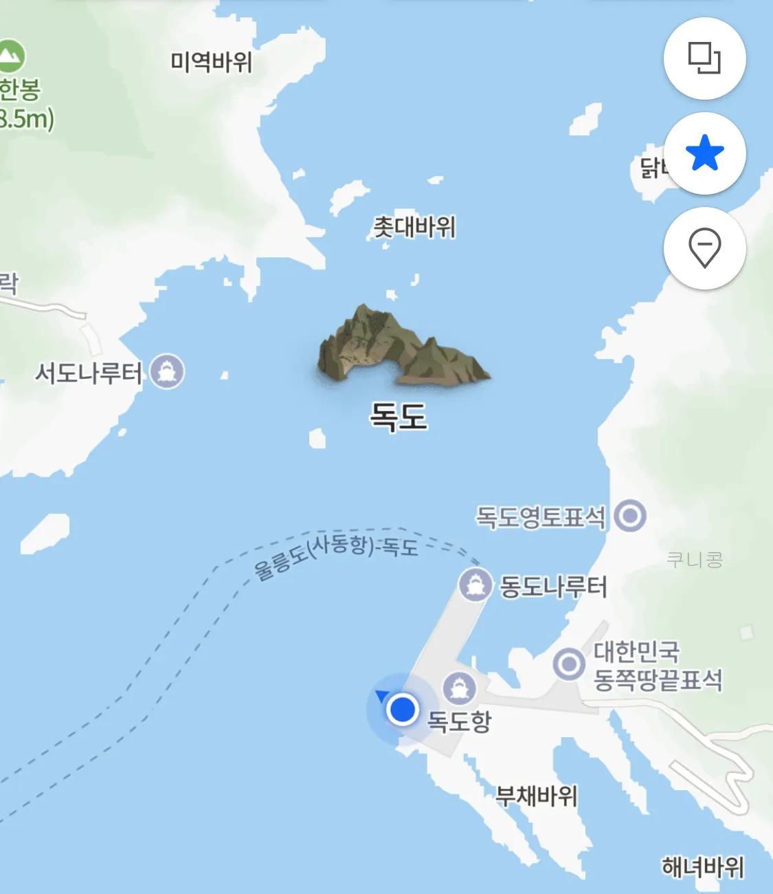 독도에서 30분정도 시간보내고 다시 배 타기전에 지도를 들어갔는데 선명하게 표시되어 있어서 신기했습니다.