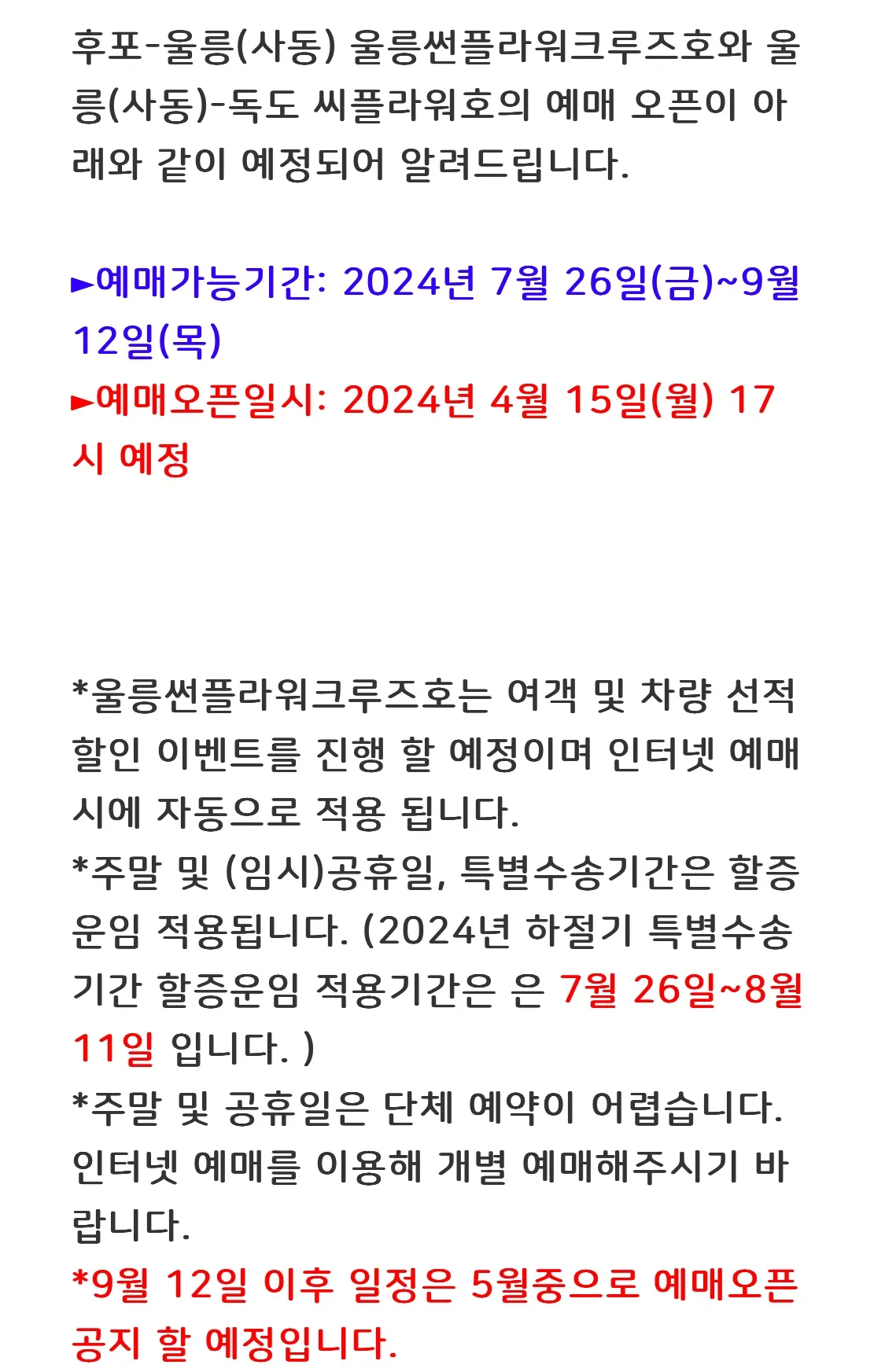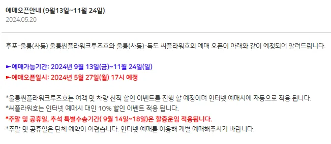 울릉도 추석연휴 크루즈 예약시기 및 가족여행 예상경비 (차량 운임포함)