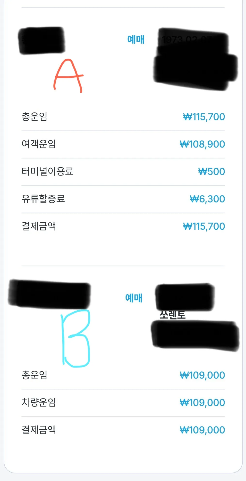 성인 4명 + 차량 1대 선박하는걸로 예약해서 약 100만원정도 경비가 들었어요. 위에 사진을 보시면 아시겠지만 A는 일반이고, B는 운전자 정보입니다. 예매할때 운전자를 설정하면 적용되는 운임이 상이하니 잘 확인하셔서 예약하시길 바랍니다.
