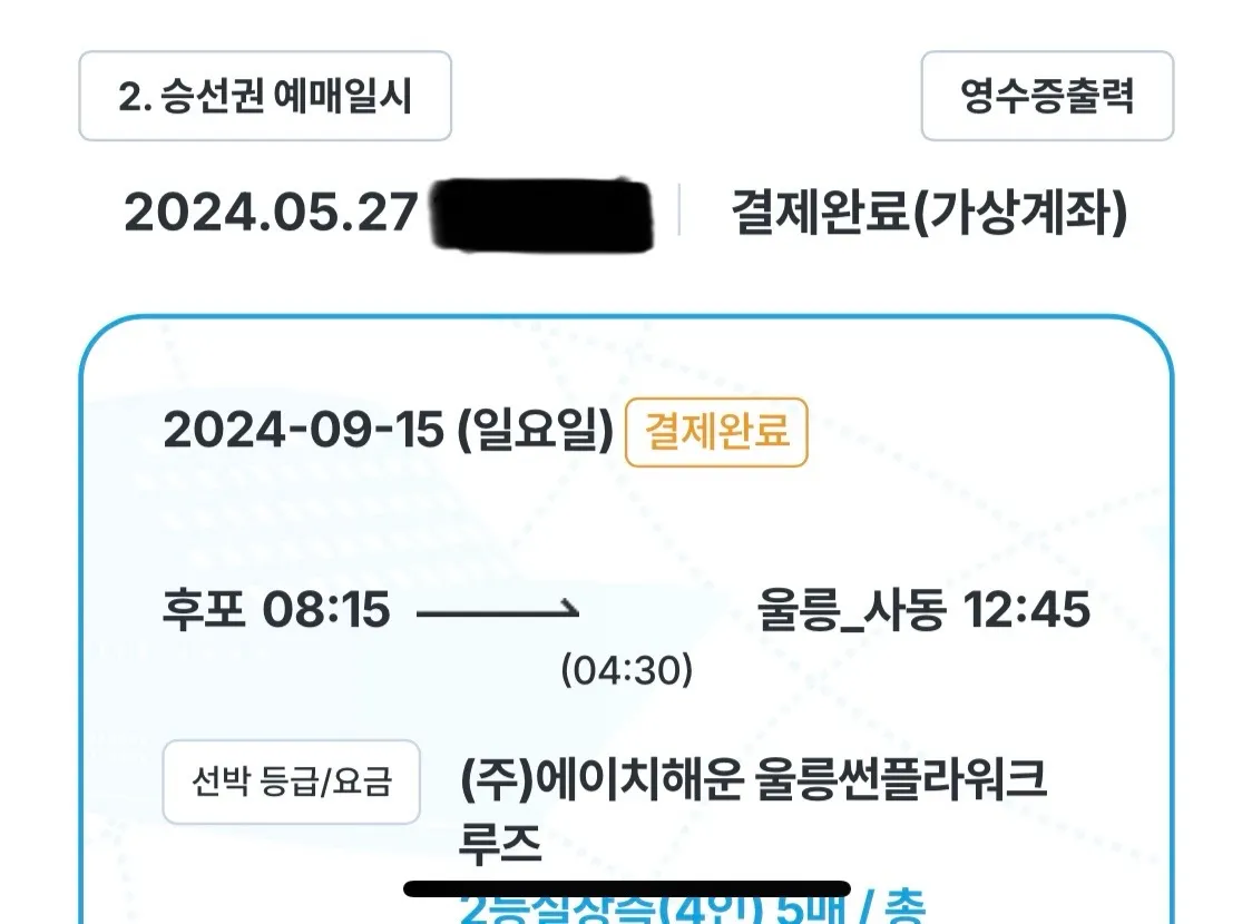 - 예매한 객실 : 울릉행(2등실 창측), 후포행(3등실 평실)