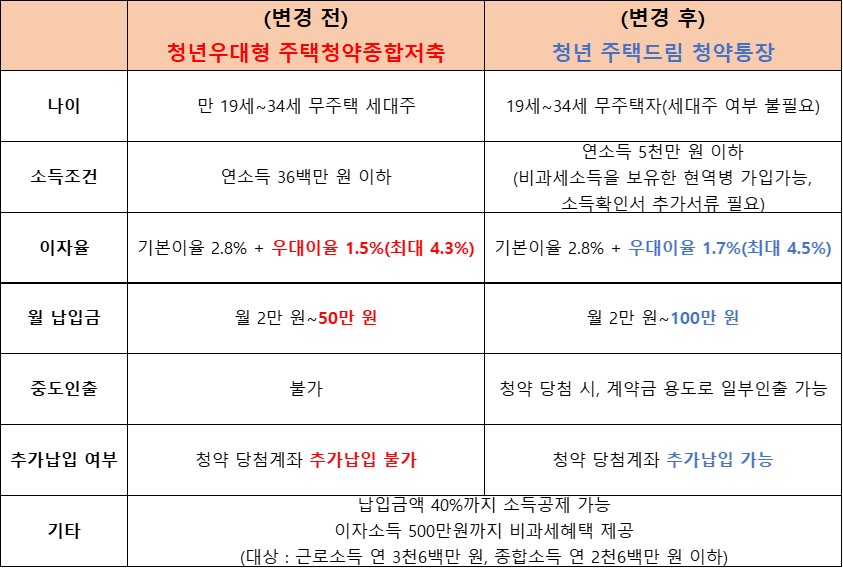 기존에 '청년우대형 주택청약종합저축' 에 가입했던 모든 분은 '청년 주택드림 청약통장'으로 전환됩니다. '주택청약종합저축' 기 가입자도 자격에 충족할 경우 '청년 주택드림 청년통장'으로 전환이 가능합니다만, 기존 계좌가 청약당첨계좌인 경우에는 전환이 불가하니 참고해 주시길 바랍니다. 저축기간별 이자율은 아래 표 내용을 확인해 주세요.