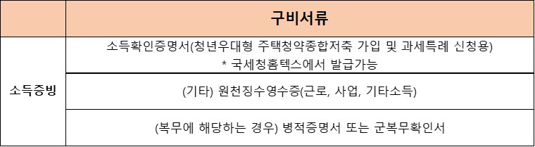 청년주택드림 청약통장 가입 제출 서류 중 첫번째는 소득증빙입니다. 저축 가입 및 과세특례 신청용으로 소득확인증명서를 구비해야 하며 해당서류는 국세청홈텍스에서 발급 가능합니다. 또 다른 소득증비서류로는 근로, 사업, 기타 소득 등의 내용을 확인할 수 있는 원천징수영수증입니다. 마지막으로 복무에 해당하는 분들은 군복무 확인서 또는 병적증명서를 준비하시면 됩니다.