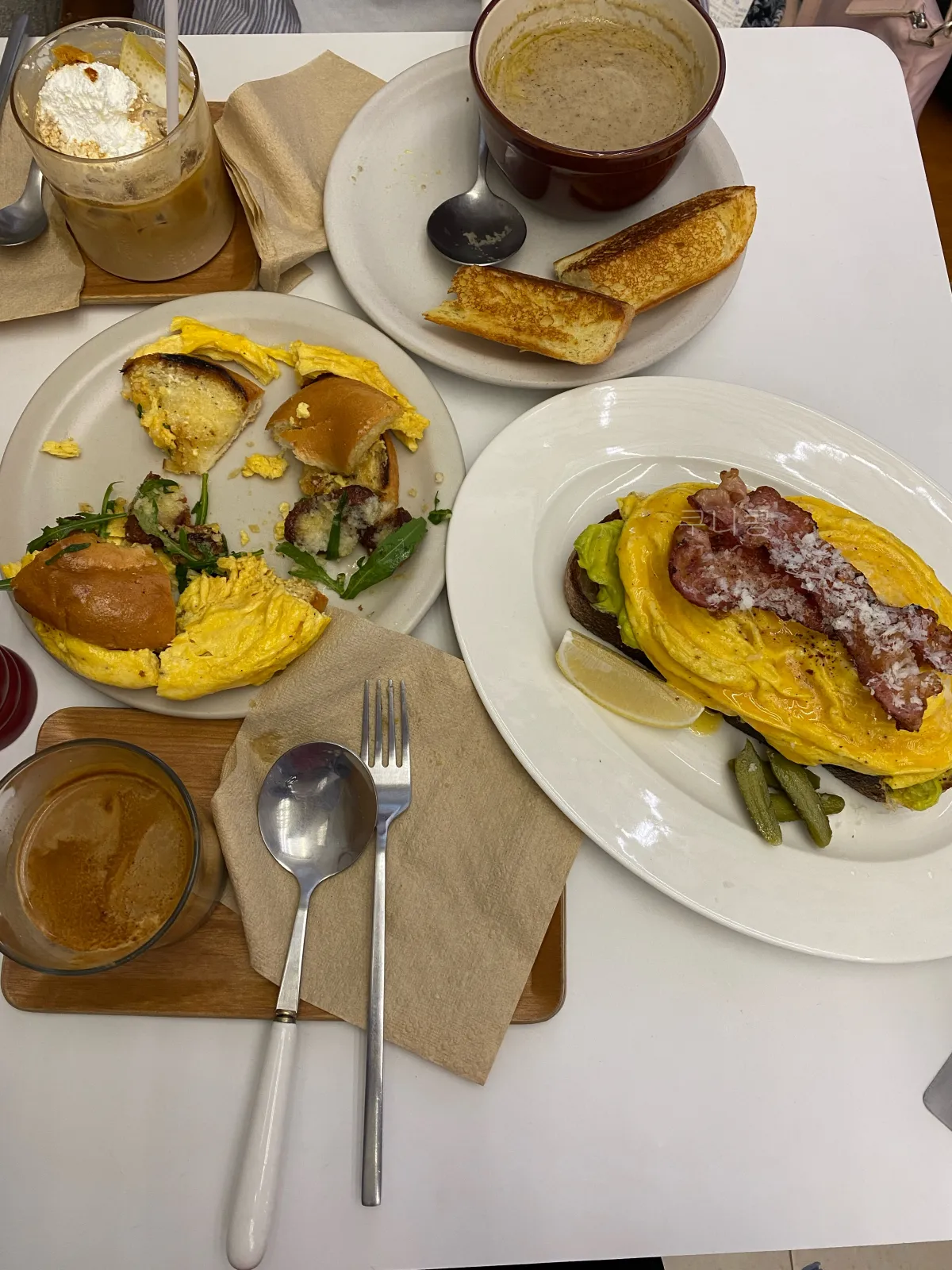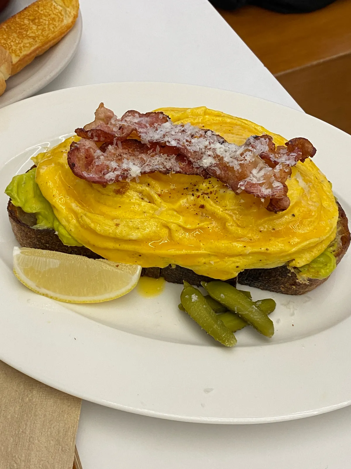 빵 + 베이컨 + 계란까지는 좋았는데, 그 아래에 있는 아보카도를 보고 후회했습니다 ㅠㅠ