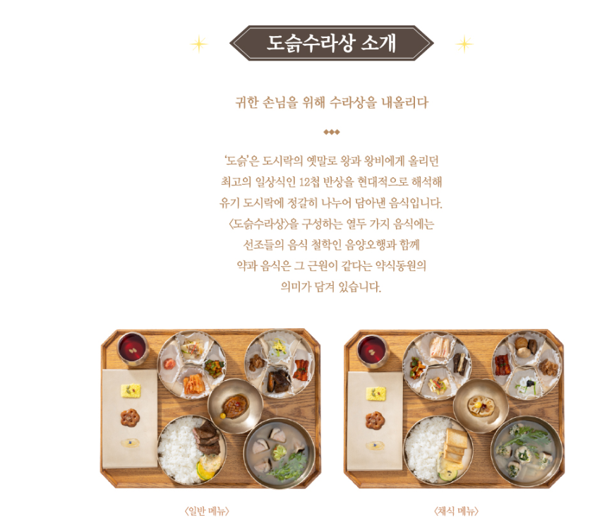 별빛야행 행사를 즐기며 맛 볼 수 있는 수라상에 대해 알아보겠습니다. 식사 비용은 입장료에 포함되어 있으며 12첩 식사를 체험할 수 있습니다. 채식 메뉴를 희망하시는 분은 행사일 3일 전 티켓링크 콜센터 1588-7890으로 사전 신청 꼭 해주셔야 합니다.