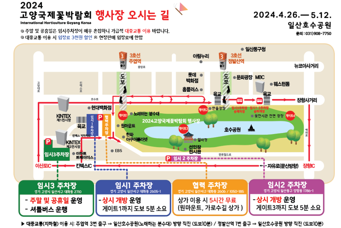 고양 국제 꽃 박람회는 친환경을 주제로 탄소 중립 사회 전환을 위한 행사입니다. 탄소배출을 최대한 줄여 안전하게 즐길 수 있도록 노력하고 있습니다. 차 없는 행사로 진행되는 만큼 입장권 할인이 되는 조건이 있습니다. 마을버스를 포함한 대중교통을 이용한 분들은 현장 입장권 3천 원 할인받을 수 있습니다. 단, 고양시민 예매권 및 얼리버드 입장권을 구매하신 분들은 제외됩니다. 대중교통으로 오시는 경우 지하철 3호선 주엽역 3번 출구에서 일산호수공원 방향으로 도보 10분 가시거나, 3호선 정발산역 1번 출구에서 일산호수공원으로 도보 10분 직진하시면 됩니다. 자차를 이용하시는 분들은 네비게이션에 '고양국제꽃박람회 임시주차장'으로 검색하셔서 오시면 됩니다. 평일에는 임시 1,2주차장 및 협력주차장(가로수길, 원마운트 상가) 주차장을 이용하시면 되고 주말과 공휴일에는 임시 1,2,3주차장 및 협력주차장(가로수길, 원마운트 상가) 이용하실 수 있습니다. 임시 주차장 위치에 따라 셔틀버스가 운행되는 곳도 있으니 자세한 내용은 아래 사진을 참고해 주세요.