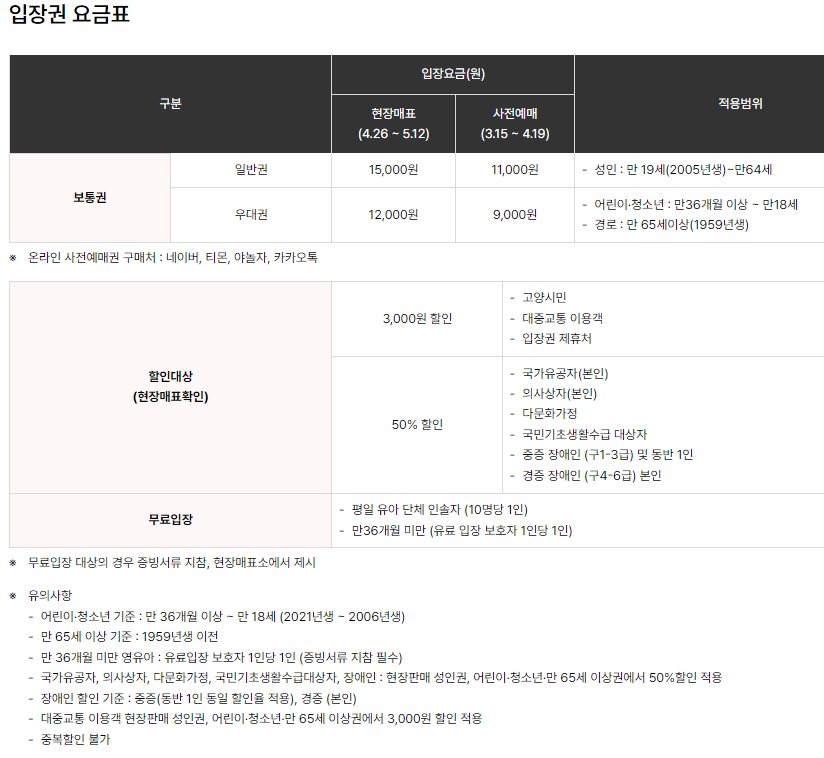 입장권은 사전예매와 현장매표 두가지 방법으로 구매할 수 있습니다. 먼저 사전예매는 3.15(금)~4.19(금) 기간에 온라인(네이버, 티몬, 야놀자, 카카오톡)에서 구매 가능하며 일반권 성인은 11000원 우대권 어린이 및 경로자는 9000원입니다. 현장매표는 4.26(금)~5.12(일) 축제장에 방문하여 구매할 수 있습니다. 일반권 성인은 15000원이며 우대권 어린이 및 경로자는 12000원입니다. 입장료 할인 및 무료입장이 가능한 대상도 있으니 아래 표를 참고하셔서 대상자는 현장매표 시 확인하시기 바랍니다. 성인은 만 19세(2005년생)~만 64세까지 해당되며 어린이 및 청소년은 만 36개월 이상~만 18세에 해당됩니다. 우대권으로 발권 가능한 경로자는 만 65세 이상(1959년생) 적용됩니다.