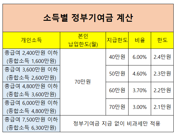 납입한도 최대인 70만원으로 계산했을 때 6%를 적용하면 4.2만 원의 기여금으로 계산되는데 소득이 2.4만 원 한도로 설정되어 있어 지원되는 정부기여금은 2.4만 원이 됩니다. 70만 원까지 납입하는 것은 자유이지만, 40만 원 이상을 납입할 경우에도 정부 기여금은 2.4만 원으로 동일합니다. 따라서 월 2.4만 원의 기여금이 한도로 적용되는 급여 2,400만 원 이하의 분들의 경우에는 40만 원에 6%를 곱하면 매달 받을 수 있는 정부기여금은 월 24,000원이 됩니다. 총 5년간 받을 수 있는 정부기여금은 계산하면 144만 원이 됩니다. 정부기여금 144만 원에 기본금리 4.5%를 적용한다면, 정부기여금에 대한 이자는 164,700원이고 이자를 포함해서 총 받을 수 있는 금액은 1,604,700원이 됩니다.