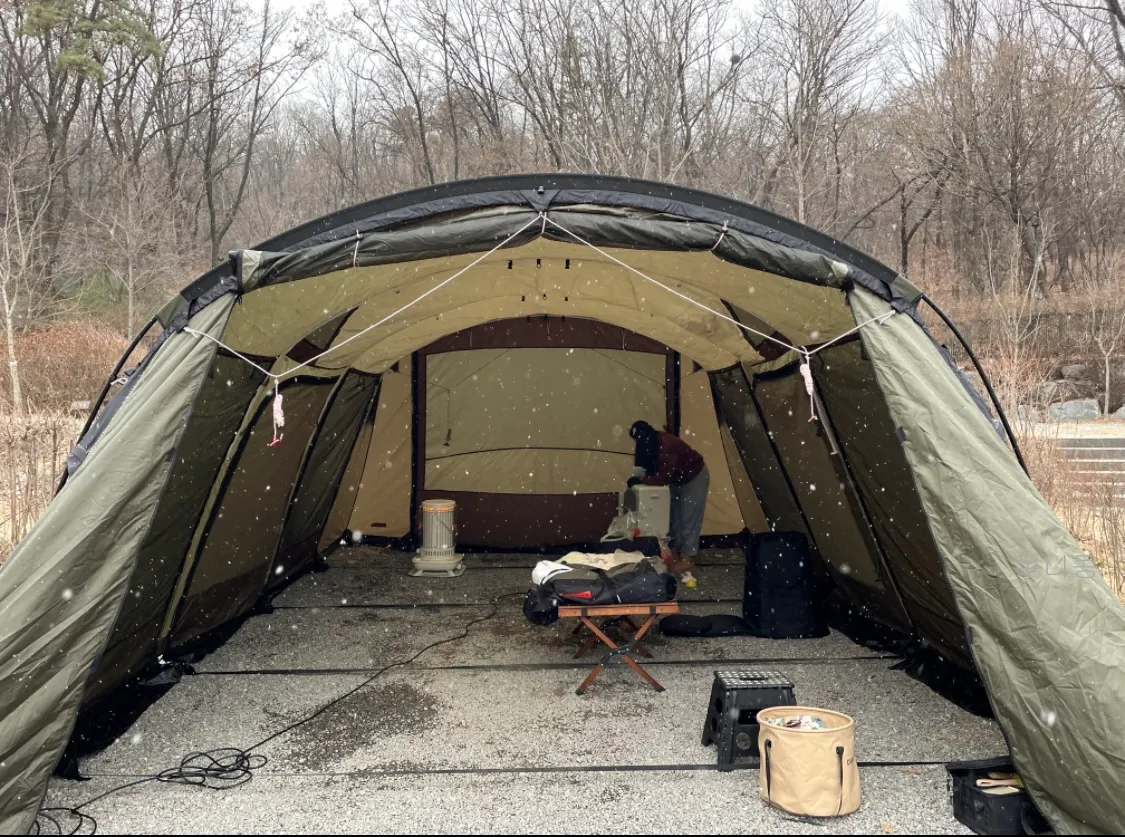 비가 와도 기본 방수는 되었고, 눈이 올 땐 루프도 치고 이용했어요. 동계캠핑엔 짐이 많은데 공간이 작은듯한 느낌이 들어 2년정도 사용하고 여유있게 사용할 수 있을 텐트를 찾아보았어요.