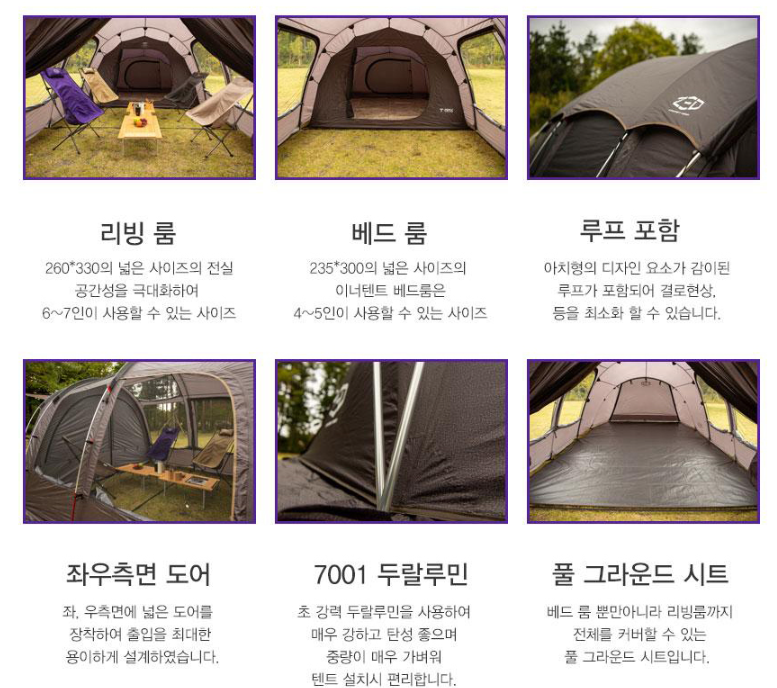 이너 텐트를 설치하고도 남는 공간이 더 넓어져서 물건 놓기에도 편리하고, 부모님도 더 좋아하셨어요. 사계절 사용해도 불편함이 없어서 앞으로의 캠핑때도 이 텐트를 쭉 사용할 것 같네요!